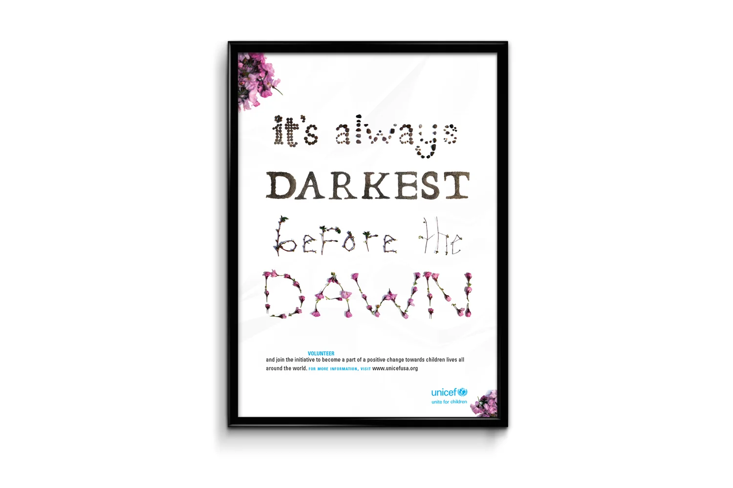 By choosing an adage as the prompt, this design began with the concept of creating letterforms by hand. This poster presents a visual language of natural materials. Referencing letterforms each letter was formed and photographed using those materials. Focusing on the concept of change and growth the design works towards encouraging volunteers to assist Unicef with achieving its goal of providing aid to children worldwide.